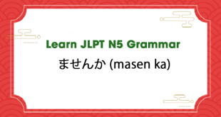 Learn JLPT N5 Grammar: ませんか (masen ka) Meaning: let’s; won’t you; wouldn’t you How to use: Verb-polite negative form + ませんか Explain: This sentence pattern is used to invite or ask the listener to do something together. Example sentences: 1. 私と一緒に晩ごはんを食べませんか? watshi to issho ni bangohan o tabemasen ka? Won’t …