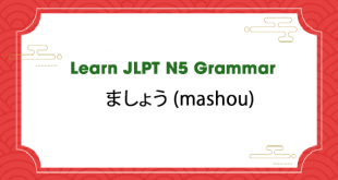 Learn JLPT N5 Grammar: ましょう (mashou) Meaning: let’s; shall we How to use: Verb-ますstem + ましょう / ましょうか Explain: Describe the urge to do something together. 『ましょう』 This sentence pattern is used to suggest, entice or call the listener to do something with the speaker. It shows the active attitude …