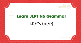 Learn JLPT N5 Grammar: に/へ (ni/e) Meaning: to (indicates direction / destination) How to use: Noun + に/へ Explain: Used to indicate a place Used to refer to someone Example sentences: 1. 明日、旅行に行きます。 Ashita, ryokō ni ikimasu. I’m going to travel tomorrow 2. 午後6時に帰ります。 Gogo roku-ji ni kaerimasu. I’ll be …